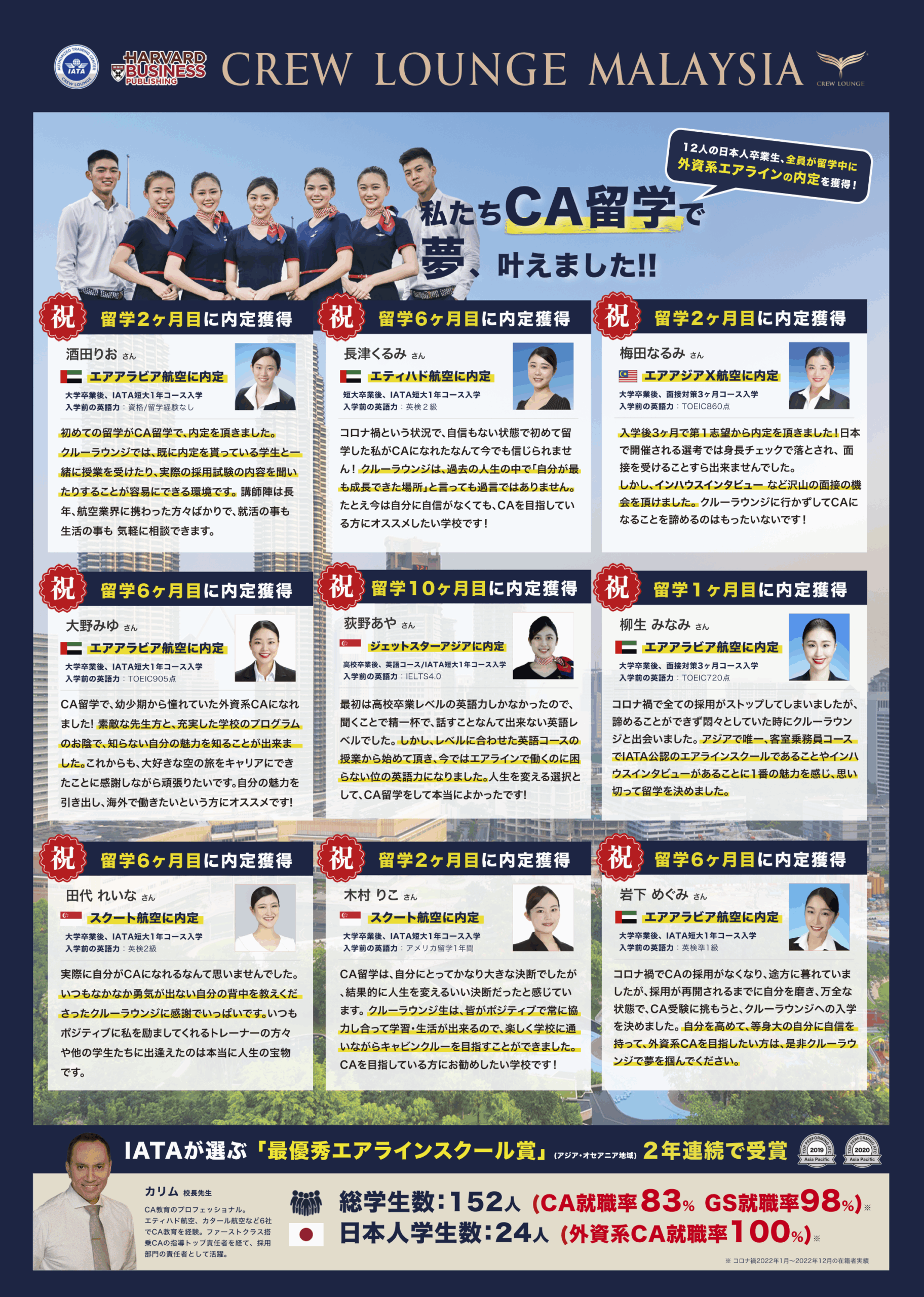 また、日本のエアラインスクールは面接練習やレジュメの添削も回数制限がありますが、クルーラウンジにはありません。クルーラウンジは、生徒全員をCAに内定させる自信があるからこそ、これらの保証を充実させています!